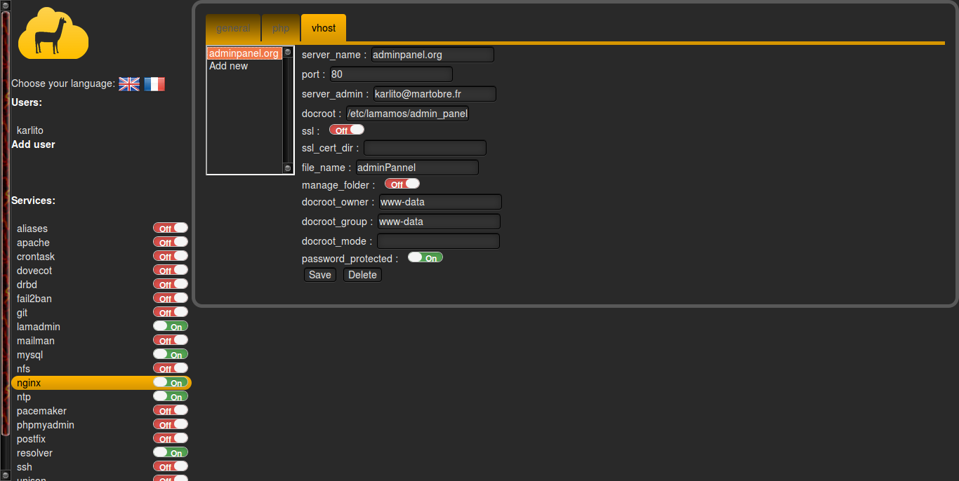 Here you can configure most of the parameters of you servers. For example we can add a new vhost to our nginx installation by clicking on nginx on the sidebar. We got then the configuration of this module that appears on the central part of the window. As you can see we got 3 tabs. The tab called "general" is here for every modules. In that tab you'll find all the configuration that are related to the module by itself. In the case of nginx we don't have anything. The other tabs are referring to the submodules that are usable with nginx. In our case we can use php and vhosts. We then select vhost. Here you got a list on the left of all the instances of this submodule. In our case this is a list of all the vhost on our system. You can click on Add new at the bottom of the list to add a new vhost. Just fill in the parameters of the new vhost you want to add and then click save.